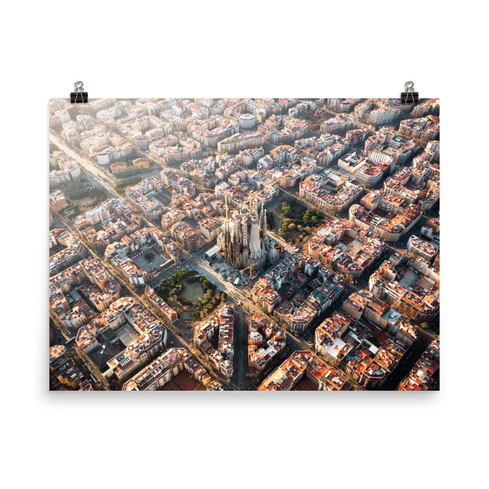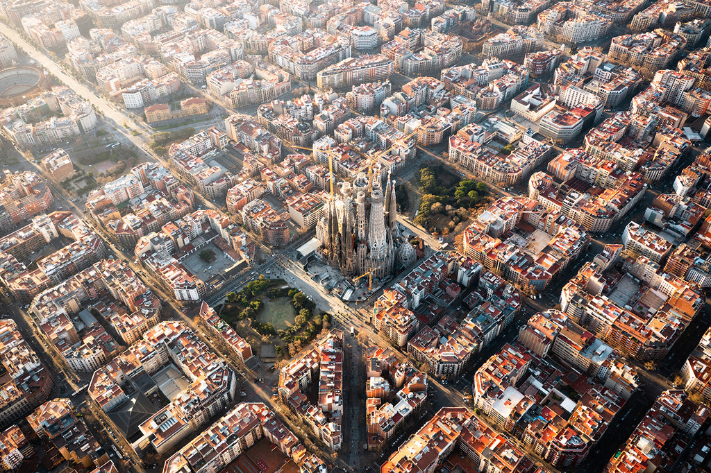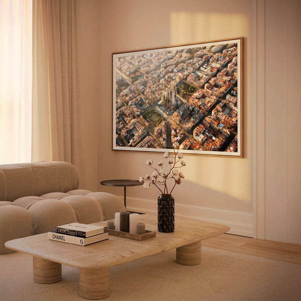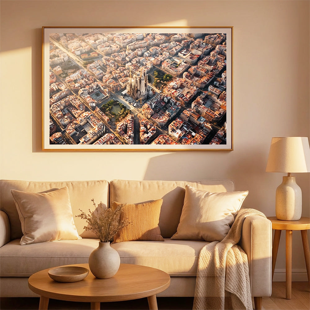 The Sagrada Família rises above the city in the most surreal way, especially from this angle. This drone shot captures the scale and magic that you just can't see from the street. It's a mix of history, art, and architecture that instantly elevates any room.